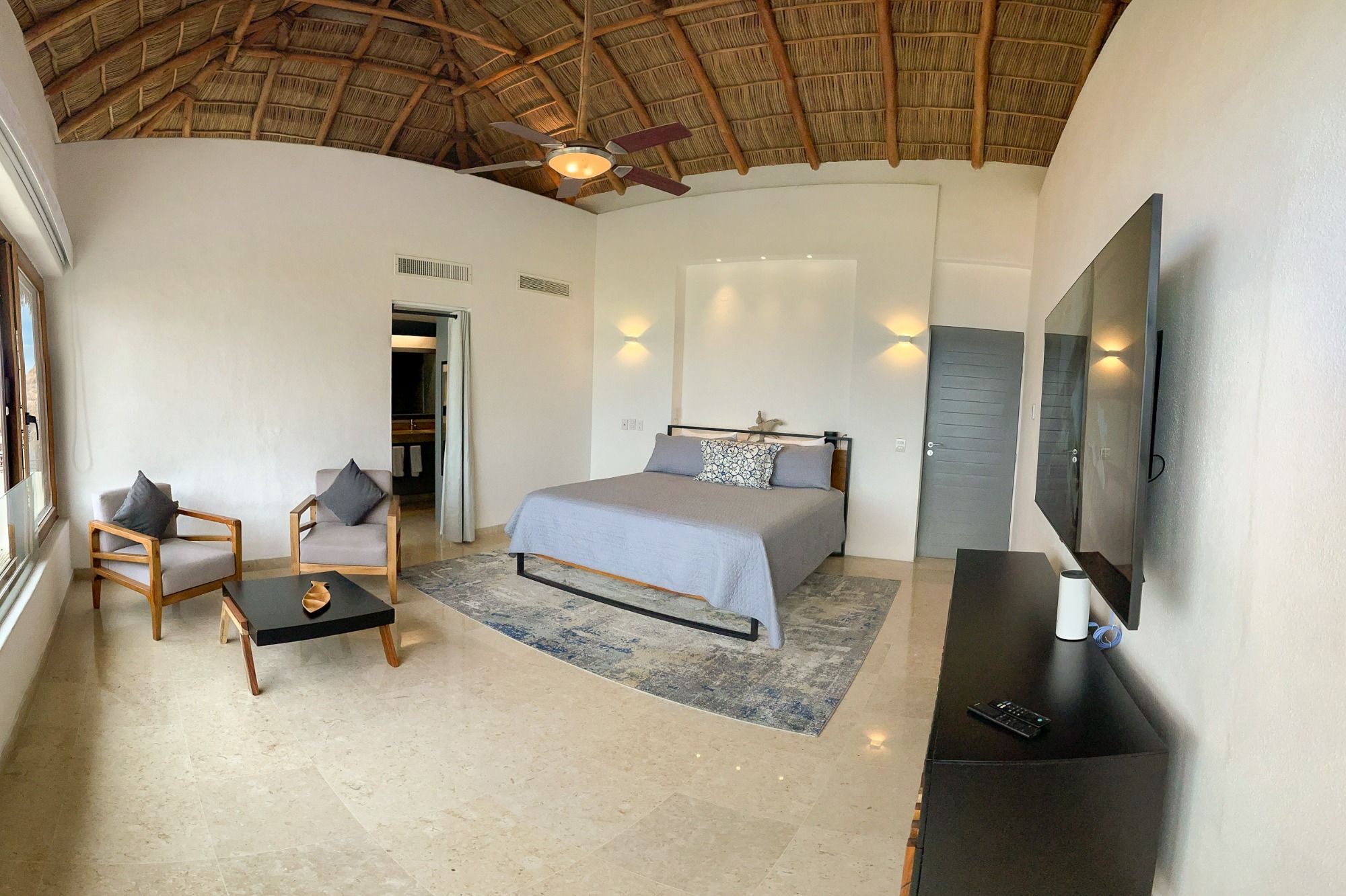 Open the corner sliding glass doors from the great room, let the ocean breezes greet you, and take your coffee or cocktail onto one of two terraces overlooking the bay. Enjoy whales playing during the day and the distant lights of Vallarta at night. Back inside, the great room welcomes you under its soaring palapa roof to a comfortable living room with bar, an 8 person parota wood dining table, and a chefs kitchen with island, open to the action and the views. There are three large suites and a den with bath down the hall, separate from the living space. Every room enjoys a spectacular view, with sunrises on one side and sunsets on the other.